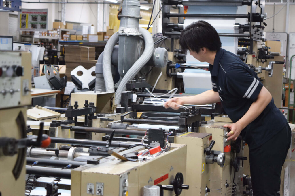 弓削社長「山田くんの使っている機械は、印刷から穴あけ、ミシン加工まで一台でできる複合機です。」
