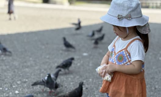 こどもと一緒に鳩へエサやり